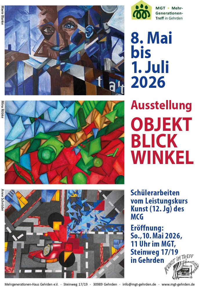 Vom. 08.05. bis zum 01.07.2026 werden unter dem Titel „Objektblickwinkel“ Schülerarbeiten des Leistungskurses Kunst der 12. Jahrgangsstufe gezeigt. Doie Eröffnung der Aussstellung ist am 10. Mai um 11 Uhr.
