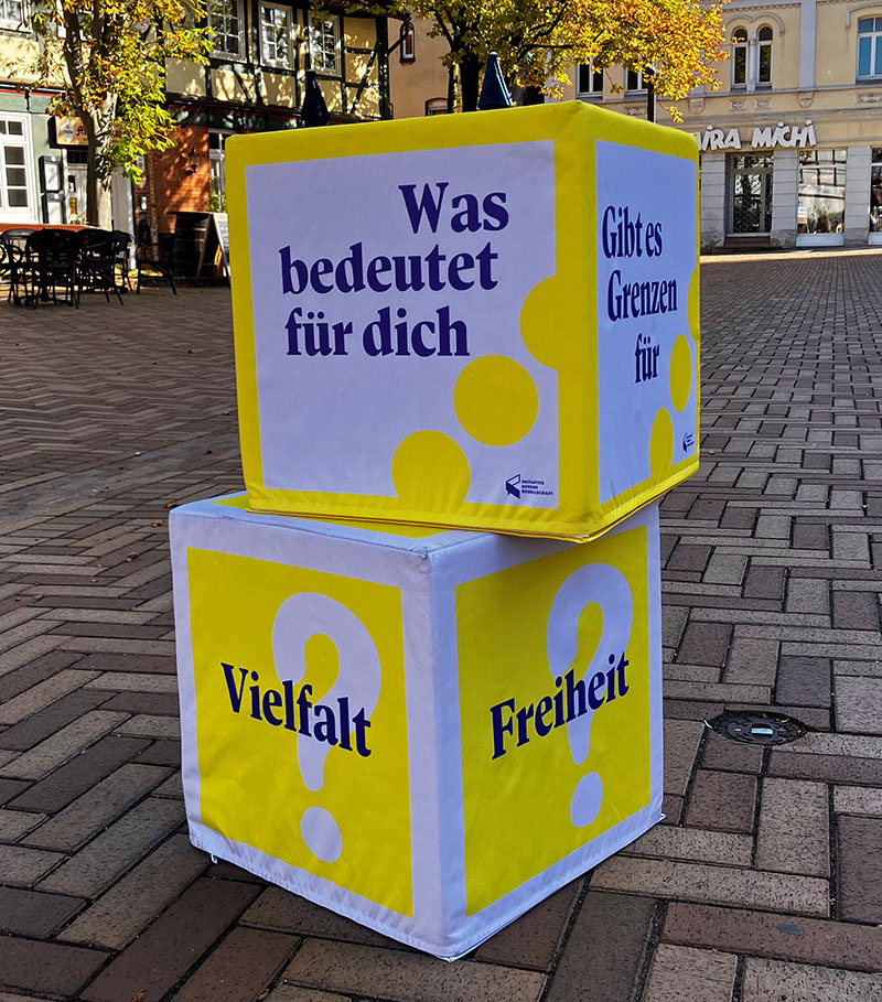 Unter diesem Motto stellte die Initiative für Demokratie Tische in der Fußgängerzone auf und lud ein zu Gesprächen und Spiel. Aus großen beschrifteten Jenga-Hölzern konnten Kinder und Erwachsene einen möglichst hohen und stabilen Demokratie-Turm errichten. Stürzt er ein, wenn „Gleichheit“, „Toleranz“ oder „Rechtsstaat“ herausgezogen werden? [Mehr dazu]